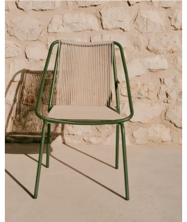 Comoda sedia con braccioli in corda di poliestere ecrù, struttura in acciaio zincato verde molto resistente alle intemperie. Estremamente pratica per interno o per esterno, puoi tirarla fuori nei mesi estivi per stare all'aria aperta e gustare il vostro giardino o terrazzo in compagnia degli amici. Uno stile mediterraneo, fresco e grintoso, che unisce modernità a tradizione. Il design e le dimensioni generose della seduta assicurano un'esperienza di comfort unica. Sotto troverete gli altri complementi della stessa linea.