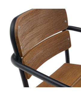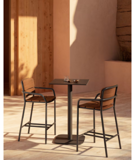 Una linea essenziale e intrigante per questo sgabello con braccioli, che enfatizza l’appartenenza allo stile industriale. Realizzato con struttura in resistentissimo alluminio nero. Seduta e schienale in legno massello di eucalipto. Un design accattivante reso ancora più prezioso grazie alle venture naturali del legno che conferiscono un ulteriore tocco, rendendo ogni pezzo diverso dall'altro. Adatto per esterno e per interno.