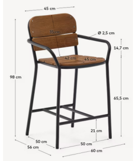 Affascinate sgabello con braccioli che unisce la naturalità del legno massello di eucalipto al tocco industriale dell'alluminio nero. Meraviglioso per casa, giardino o terrazzo, ma anche per bar, caffè, residence, ristoranti, alberghi, b&b, resistentissimo alle intemperie e ai raggi UV. Trattato per esterno. Portata massima fino a 130 Kg. Sotto troverete la sedia da abbinare. Nella foto della scheda tecnica ci sono tutte le misure.