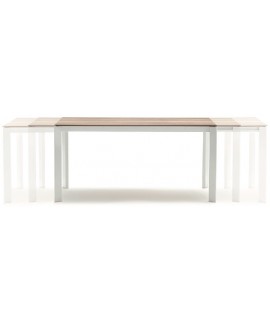 Tavolo allungabile con apertura telescopica. Struttura in alluminio verniciato bianco e piano in hpl, un materiale resistentissimo agli agenti esterni, graffi e calore, disponibile nei seguenti colori: legno, cemento o bianco. Ideale per i tuoi spazi esterni, giardino o terrazzi. Una linea pulita e raffinata. Sotto ci sono le sedie della stessa linea da abbinare al tavolo.