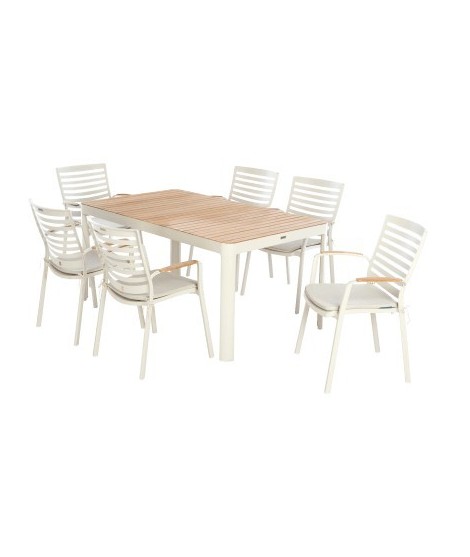 Una linea fresca, che porta raffinatezza e prestigio al vostro ambiente esterno, comoda e resistente alle intemperie. Set composto da un tavolo fisso e 6 sedie impilabili. Il tavolo è realizzato con struttura in alluminio verniciato bianco e piano in legno di teak. Piano a doghe e gambe smontabili. Le sedie sono in alluminio bianco con finiture sui braccioli in legno di teak e cuscinetto per la seduta i tessuto idrorepellente color sabbia. Viterie in acciaio INOX. L'alluminio ha la caratteristica di una elevata resistenza. Il legno di teak pregiato e riconosciuto per le sue proprietà agli agenti atmosferici e raggi UV. Bello, elegante e di design. Per il vostro ambiente esterno, giardino o terrazzo, ma adatto anche per bar, caffè, residence, ristoranti, locali sul lungomare, alberghi, b&b, stabilimenti balneari.