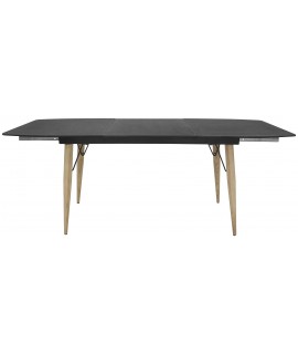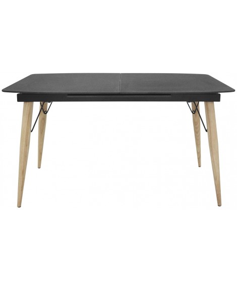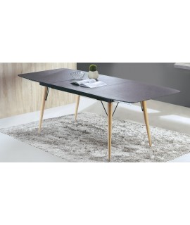 Bellissimo ed elegante tavolo con piano allungabile in cristallo effetto pietra e struttura in metallo verniciato nero e gambe in legno. Un tavolo moderno che conferirà uno stile ricercato e di design al vostro ambiente.