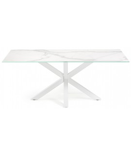 Tavolo di design. Affascinante basamento ad incrocio in acciaio bianco e piano in vetro porcellanato effetto marmo bianco. Un nuovo materiale che oltre ad essere molto solido e resistente, mantiene le sue caratteristiche inalterate nel tempo, molto resistente agli urti, impermeabile alle macchie e ai liquidi e sopporta le alte temperature. Disponibile in tre misure. Un tavolo elegante, di qualità e di grande arredo, sarà il protagonista principale della vostra casa.