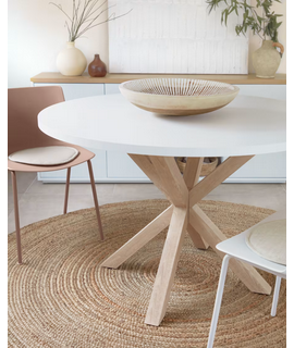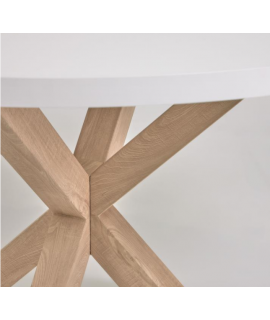 Armonioso, elegante e raffinato tavolo con basamento incrociato in acciaio color legno e piano rotondo in melammina bianca. Un tavolo davvero invitante, unico e intrigante, dove design e stabilità lo caratterizzano. Un look attraente e moderno.