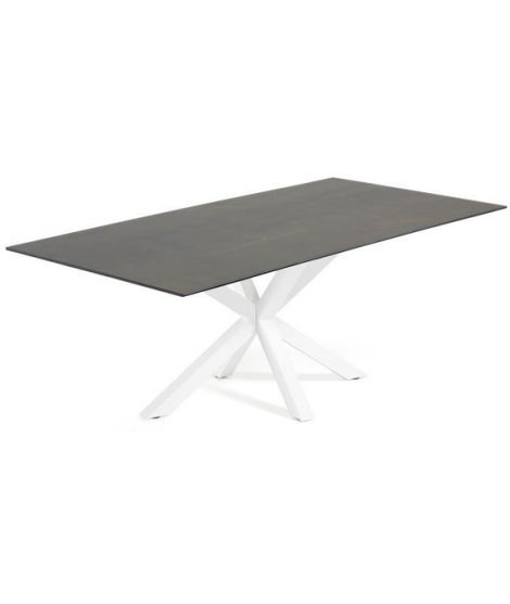 Bello e molto elegante, tavolo fisso rettangolare con gambe in metallo bianco ad incrocio e piano in vetroceramica gres con finitura Iron Moss. E' il tavolo di design da scegliere per un arredo moderno. Solido e resistente il piano in gres porcellanato unito al vetro, è un materiale innovativo che mantiene le sue caratteristiche inalterate nel tempo, molto resistente agli urti, impermeabile alle macchie e ai liquidi e sopporta le alte temperature.