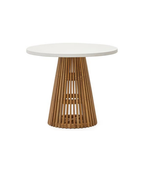 Particolare e bello questo tavolo, ideale per arredare il vostro ambiente. Grazie all'alta resistenza dei materiali con la quale è realizzato, base in legno massello naturale di teak e forte piano in cemento bianco, è molto pratico sia per interno che per esterno. Un complemento d'arredo scelto per arredare con gusto raffinato e intrigante.