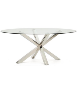 Armonioso, elegante e raffinato tavolo ovale con basamento incrociato in acciaio INOX inossidabile e piano in vetro temperato. Un tavolo davvero invitante, unico e intrigante, dove design e stabilità lo caratterizzano. Un look attraente e moderno.