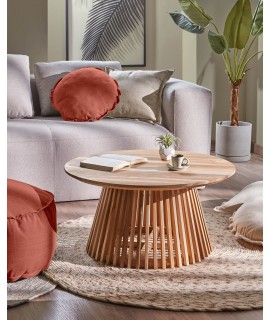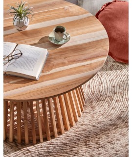 Tavolino rotondo in legno di teak, sobrio e grintoso. Lineare ed essenziale, bello, dinamico ed elegante, adatto a tanti ambienti, con un design originale di pezzi realizzati con lo stesso tipo di legno e finitura, posizionati uno per uno.
