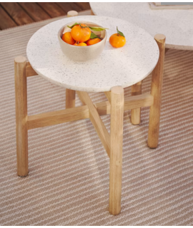 Raffinato e particolare tavolino per esterno, molto resistente ai raggi e alle intemperie. In legno massello di eucalipto naturale e piano in cemento bianco. Sotto troverete altri complementi della stessa linea. Nella foto della scheda tecnica, scorrendo tra le foto, troverete tutte le misure.