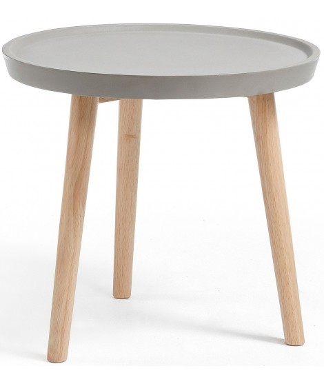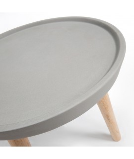 Incantevole tavolino rotondo con una base formata da tre piedi in legno di acacia naturale e piano in polycemento, adatto per interno e per esterno.