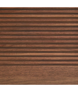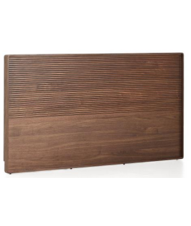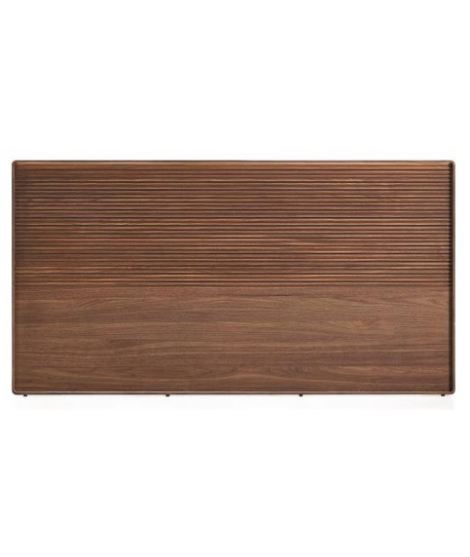 Raffinata testata per letto matrimoniale con rete da 160 o 180 cm, impiallacciata noce. Bella ed elegante, con un' accurata lavorazione fatta a mano da esperti artigiani. Legno con fresatura lineare e striscia luminosa a LED sulla parte superiore.